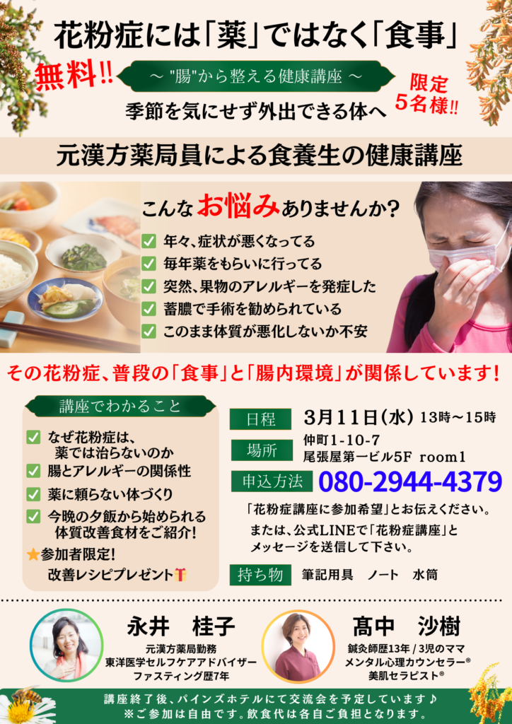花粉症には「薬」ではなく「食事」~健康講座のお知らせ~|浦和の首こり・肩こり専門鍼灸院