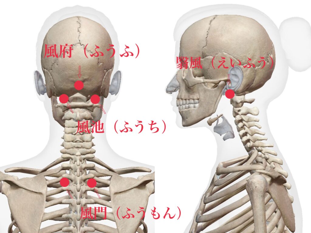 風府(ふうふ)、風池(ふうち)、風門(ふうもん)、翳風(えいふう)という4つのツボがあります。