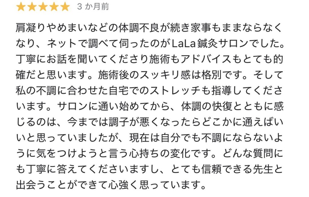 ”薬に頼りたくない”と思っている患者様は非常に多く、「首肩こりが辛くて、めまいもする…どうにかしたい」とすがる思いでLaLa鍼灸サロンにお越しいただいています。