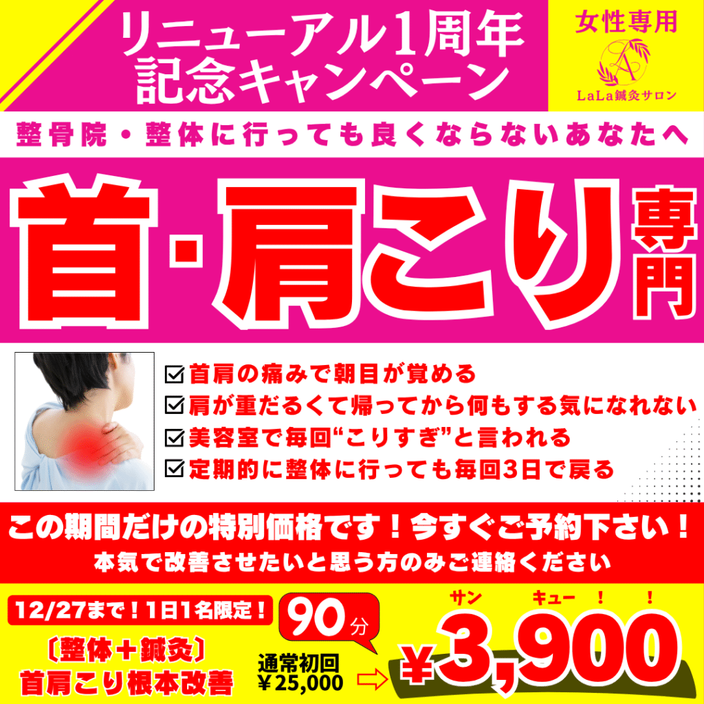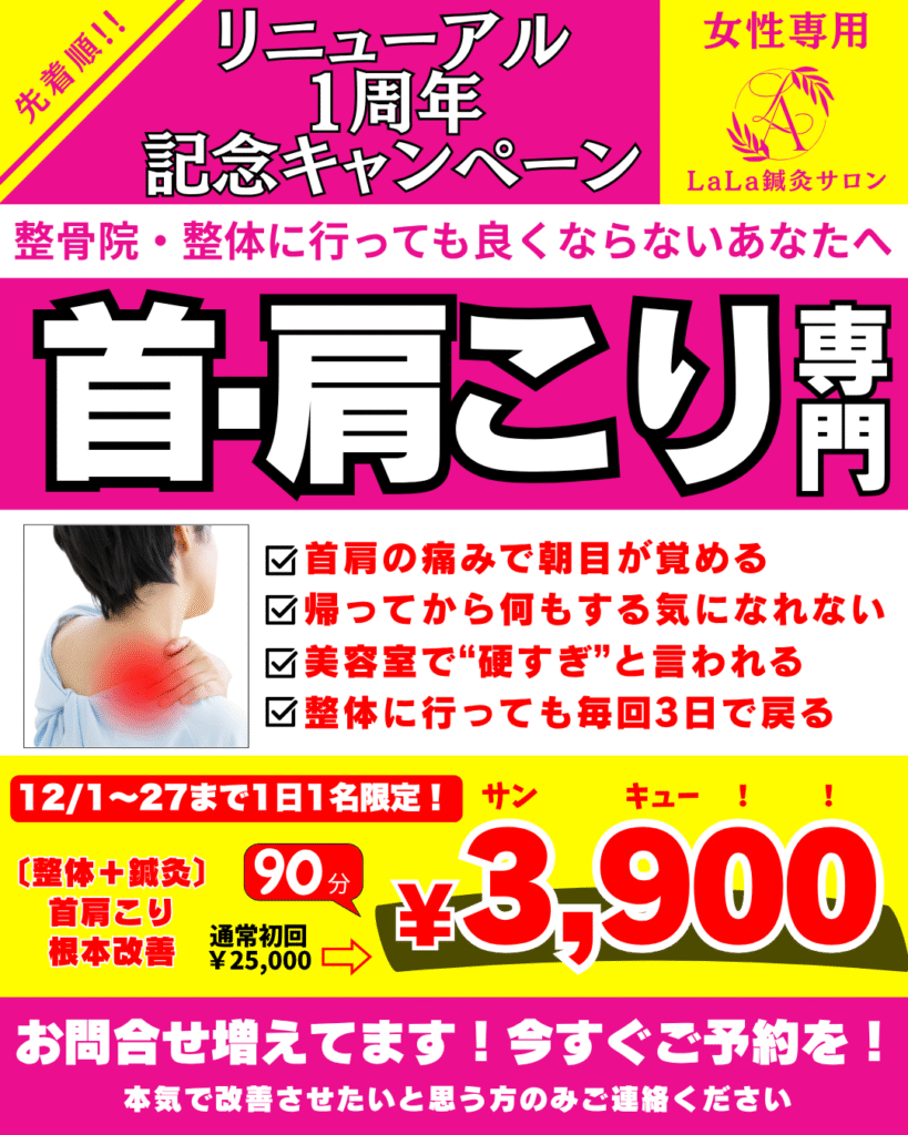 私はこの機会に、まだLaLa鍼灸サロンに来たことがない方々に向けて、『首肩こりは自分と向き合えば治る!』ということを広く伝えて行きたいと思っているし、その事を体感しに来て欲しいと思ってこの内容を企画しました。