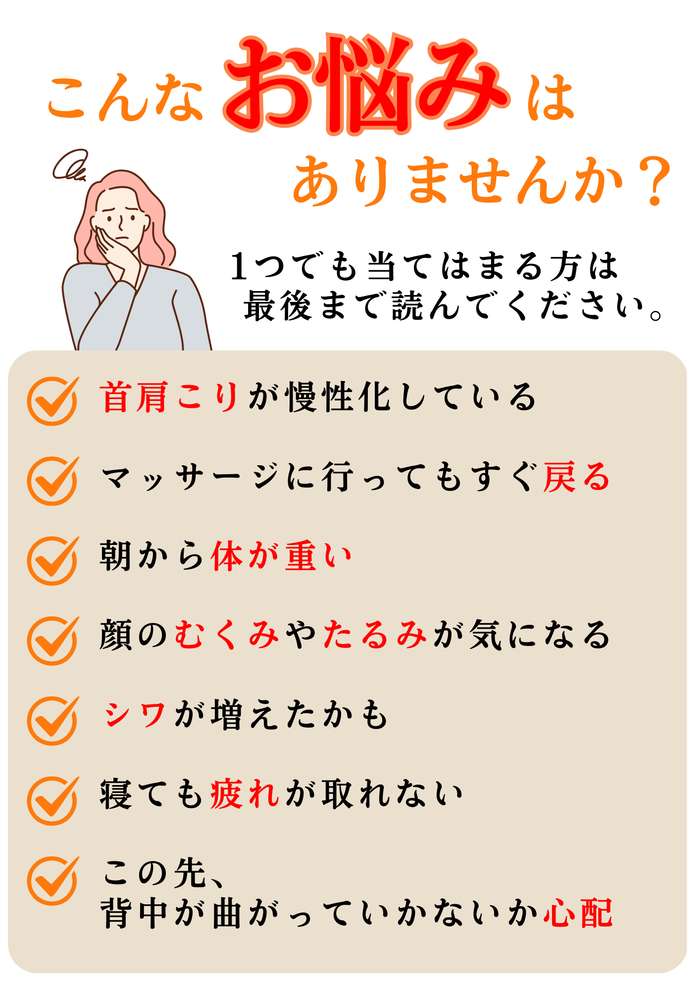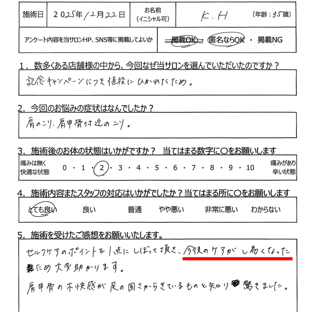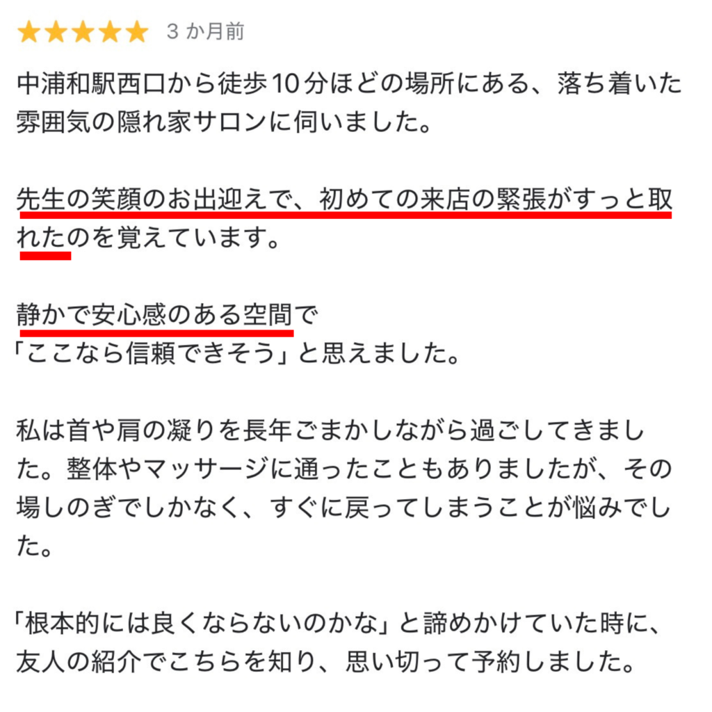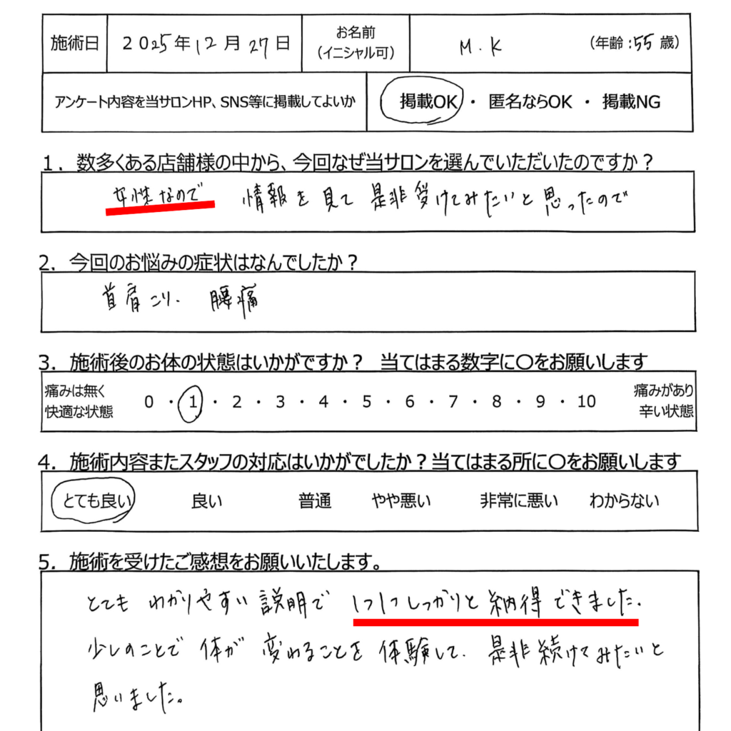 男性セラピストには言えないような悩みでも、女性同士だからこそ理解でき、分かりあえることもあります。首肩こりで悩む多くの女性は、こういった内面の悩みも深く関わっています。